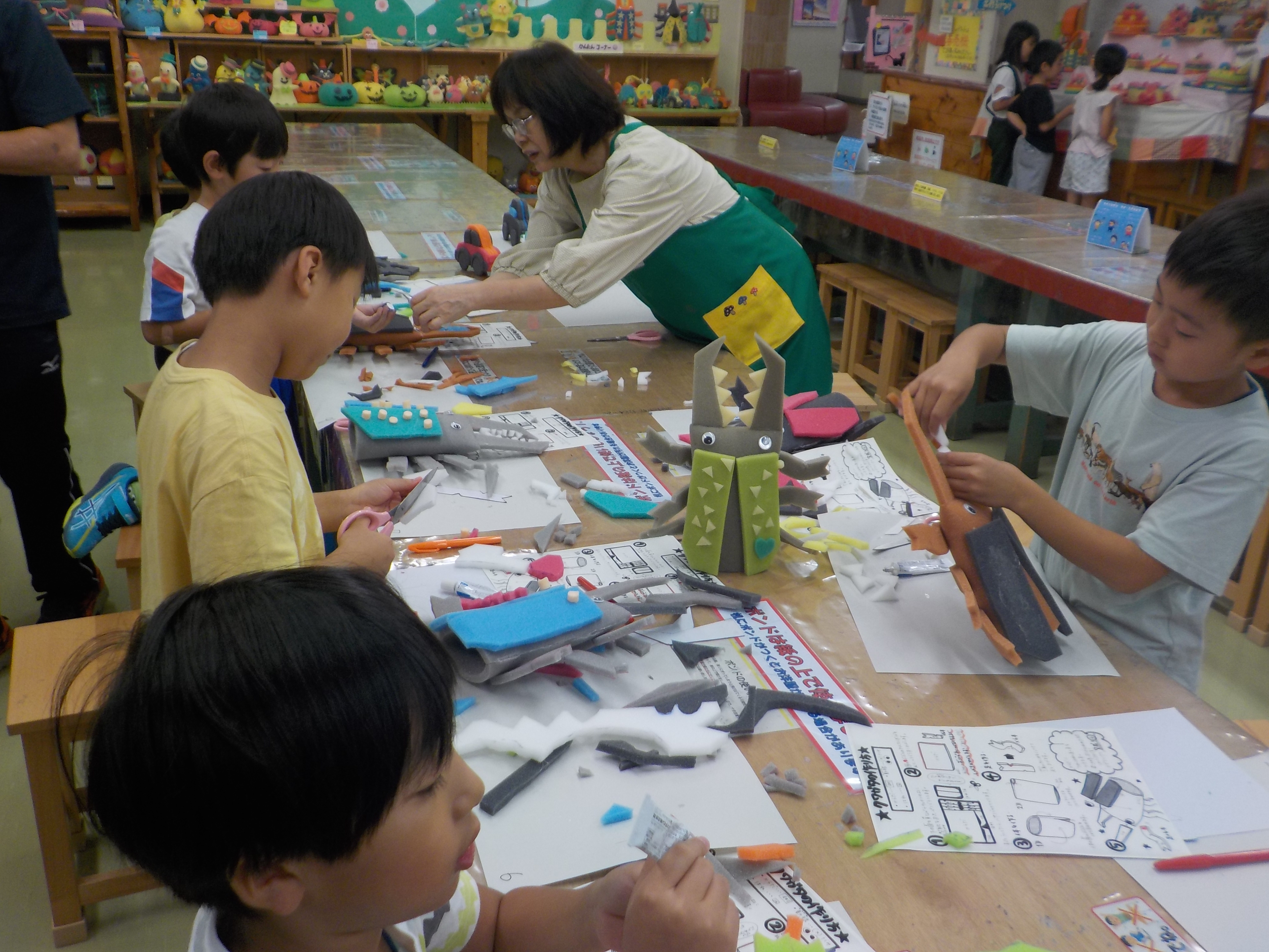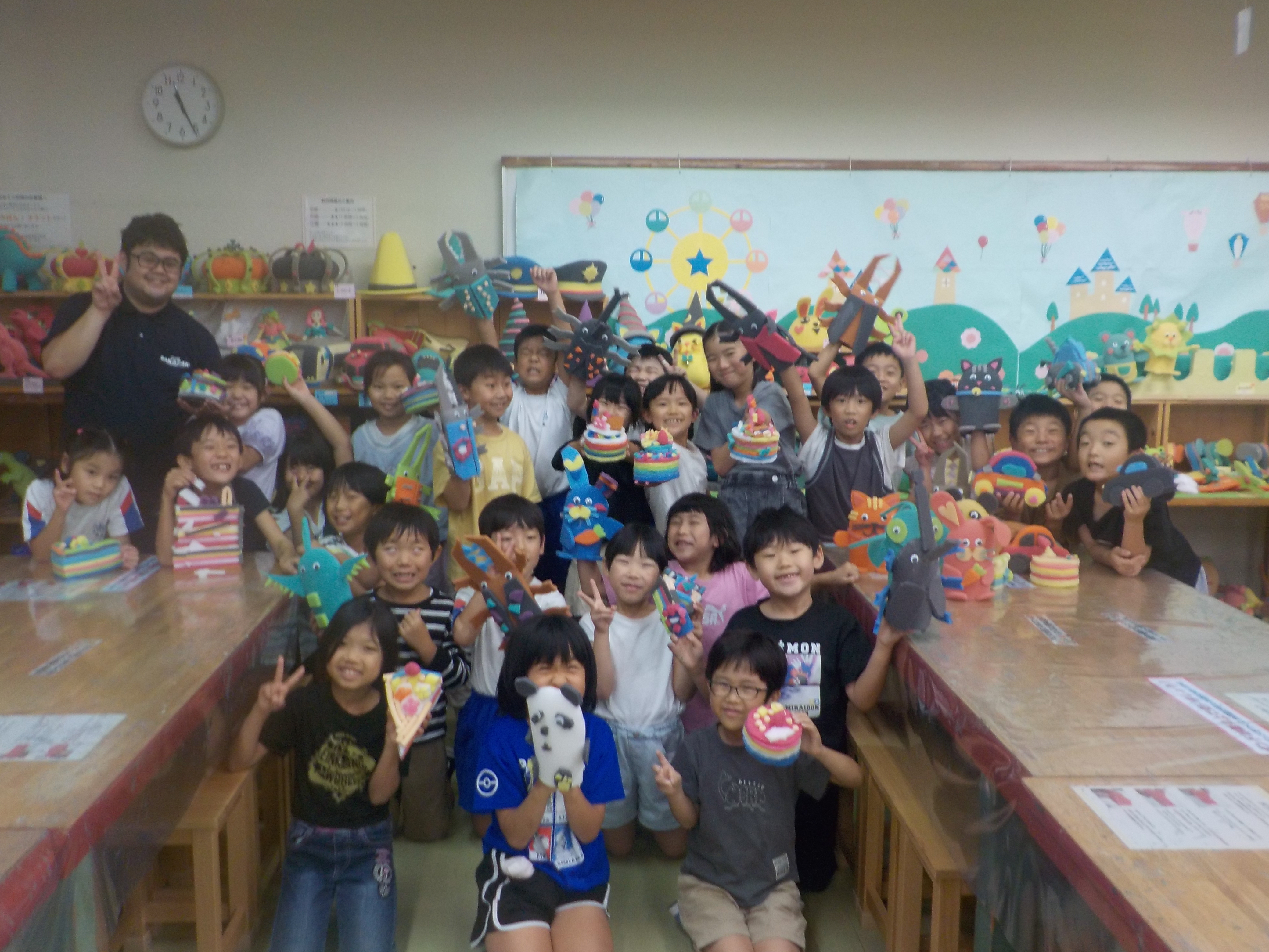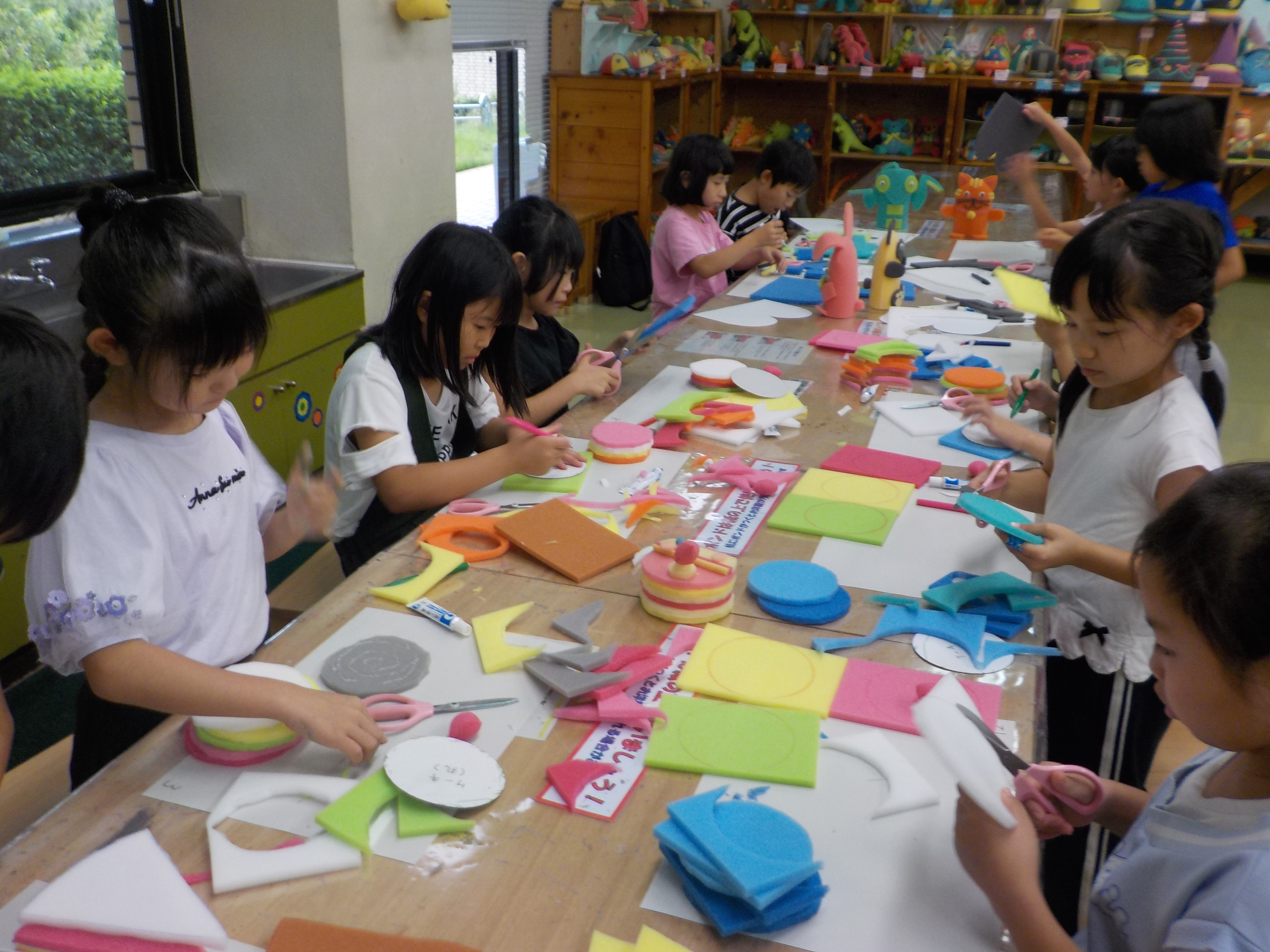 10日(金)に、2年生でおかざき世界子ども美術博物館に行きました。ウレタン工作教室で、自分たちが事前に決めていたものを作りました。型紙に合わせてウレタンを切ってボンドを使って貼り合わせました。同じ形の作品でも、一人ひとりの個性が生きた素敵な作品になりました。工作が終わった後は建物の前の広場でおうちの人が作ってくれたお弁当を食べ、広場でいっぱい遊びました。とても楽しい校外学習になりました。