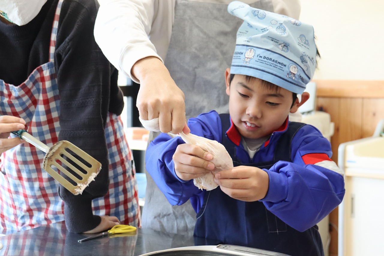 親子で力を合わせて作ったいちご入りのホットケーキ。子どもたちも保護者の方々も笑顔があふれる「イチゴを味わう会」になりました。