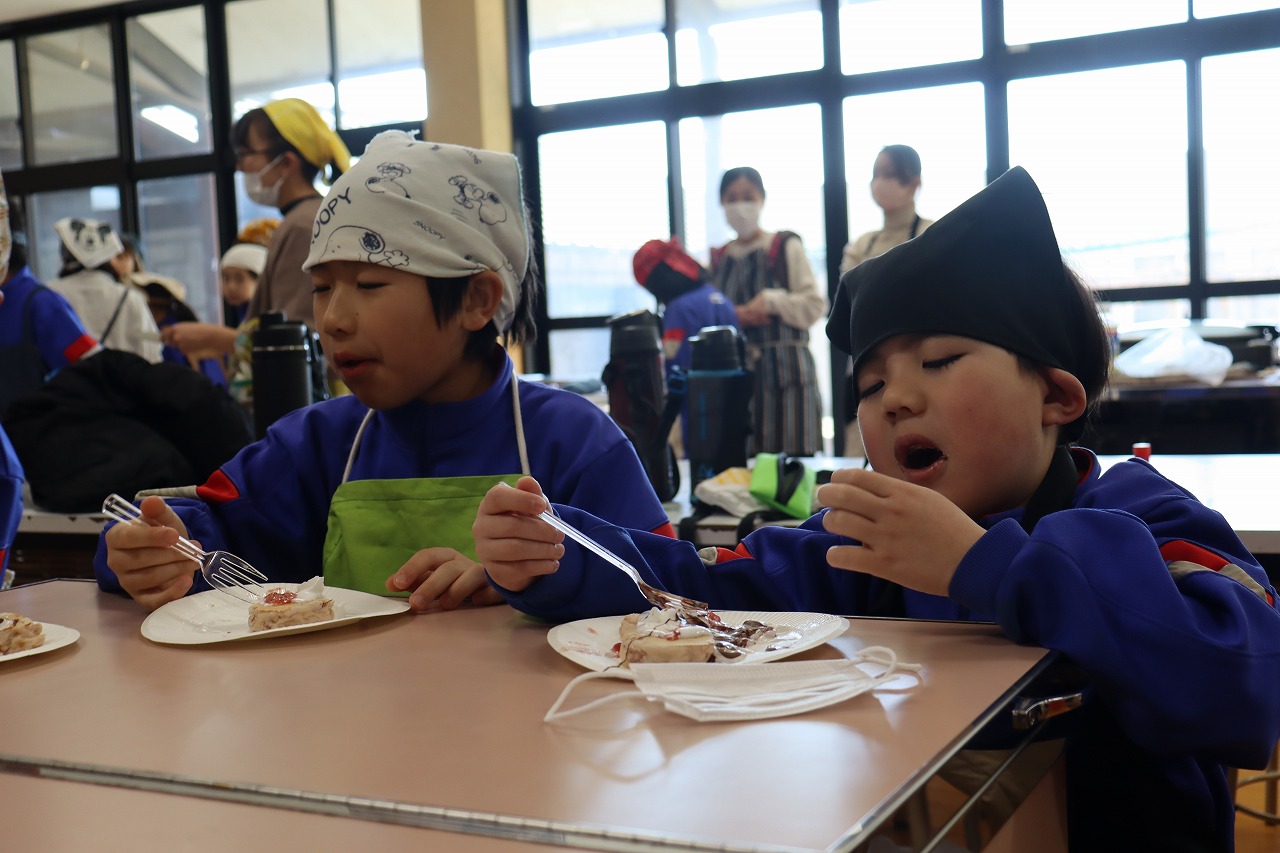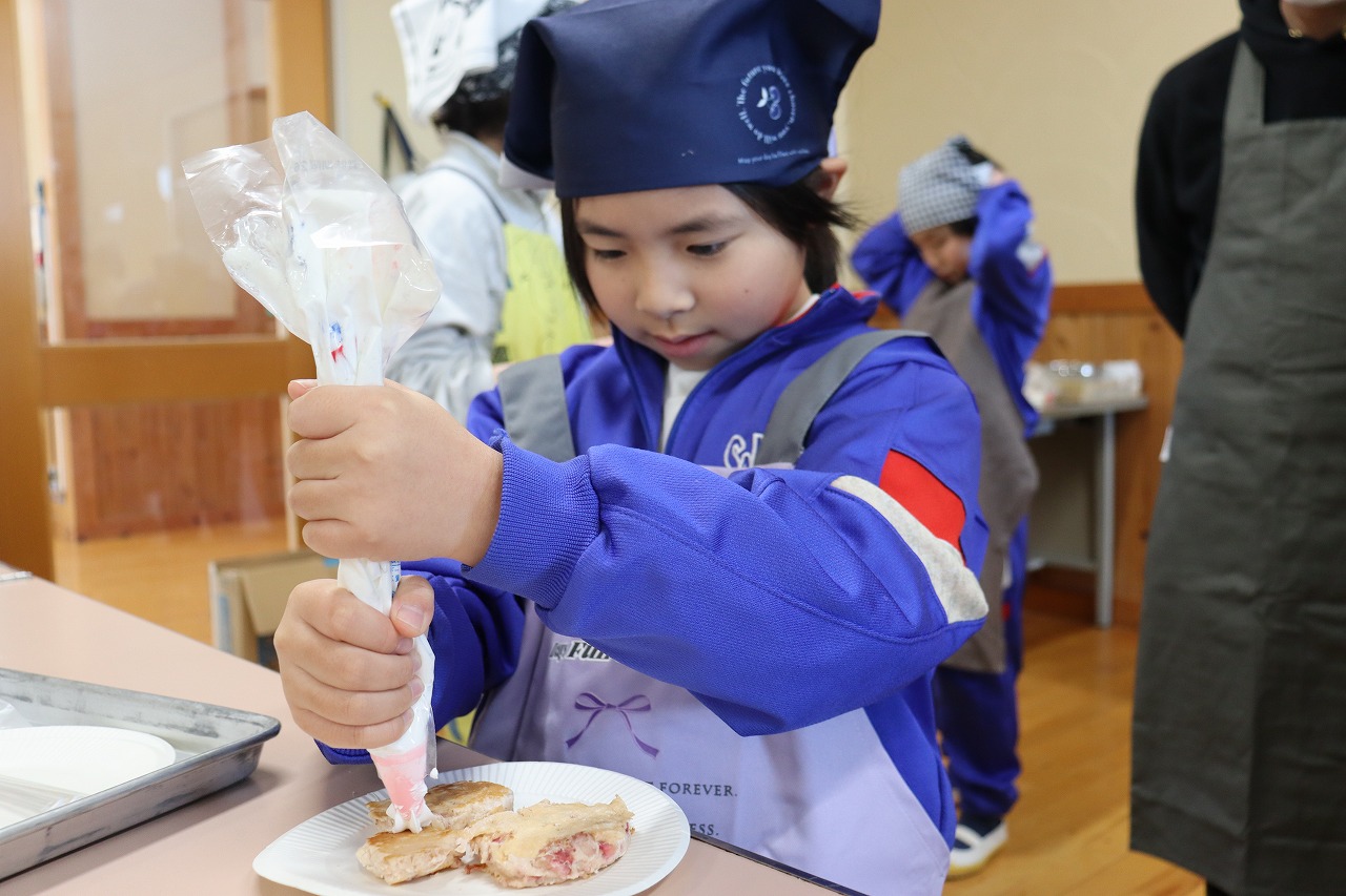 2026年2月4日 19時40分3年生は総合的な学習の時間の一環で、いちごを育ててきました。先月から実が赤く色づき始め、たくさん収穫することができました。そこで、4日(火)に保護者のみなさんと「いちごを味わう会」を行いました。今まで育ててきたいちごをホットケーキに混ぜて味わいました。ホットケーキを焼き始めると、いちごの甘い匂いがして、子どもたちは焼けるのが待ち遠しそうでした。焼けたホットケーキは湯煎したチョコレートやホイップクリーム、取れたいちごで作ったジャムをのせて食べました。自宅から型抜きを持ってきて、好きな形にかたどっておいしくいただきました。子どもたちは、「イチゴが甘酸っぱくておいしかったです」と、自分たちが育てたいちごの味に満足していました。