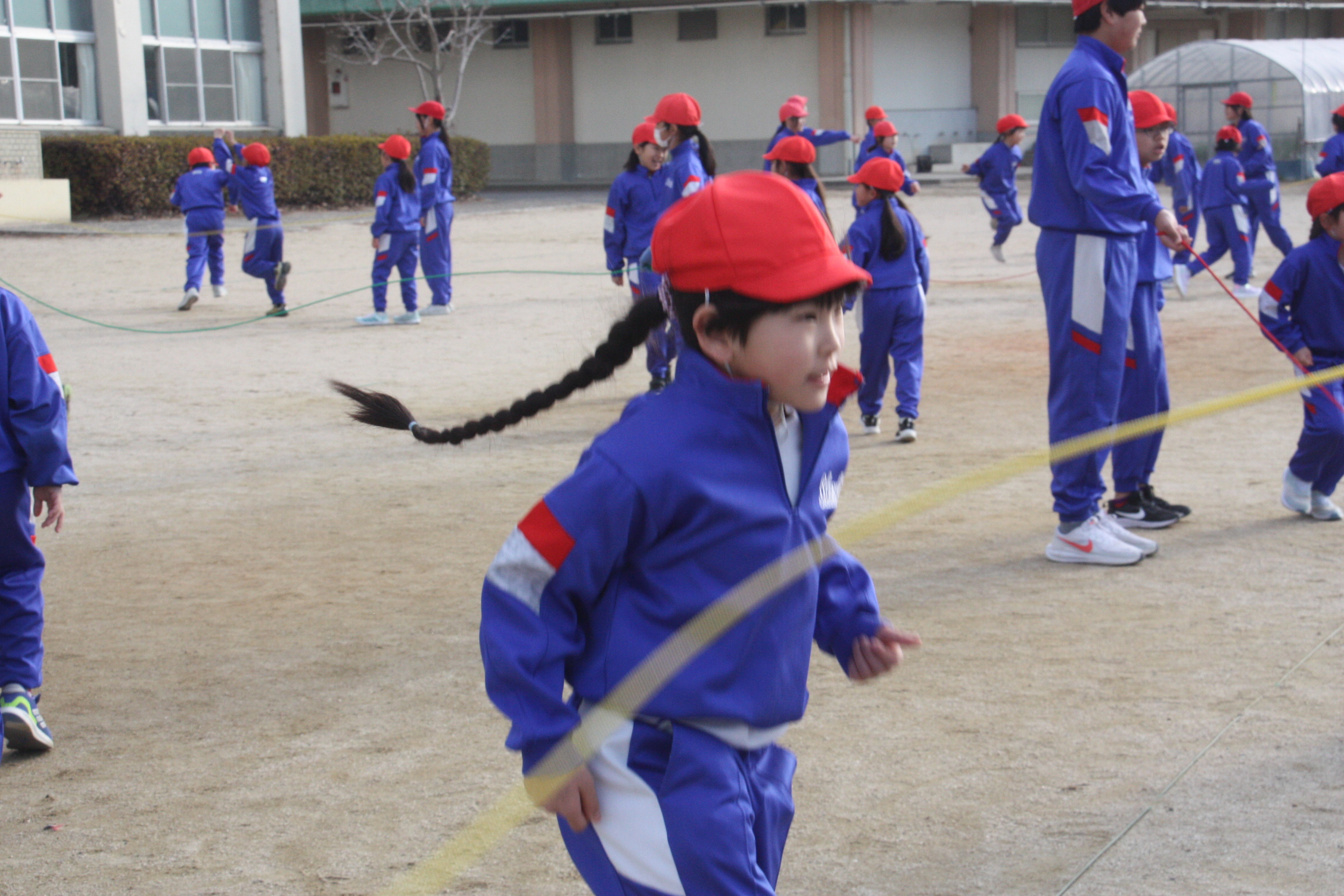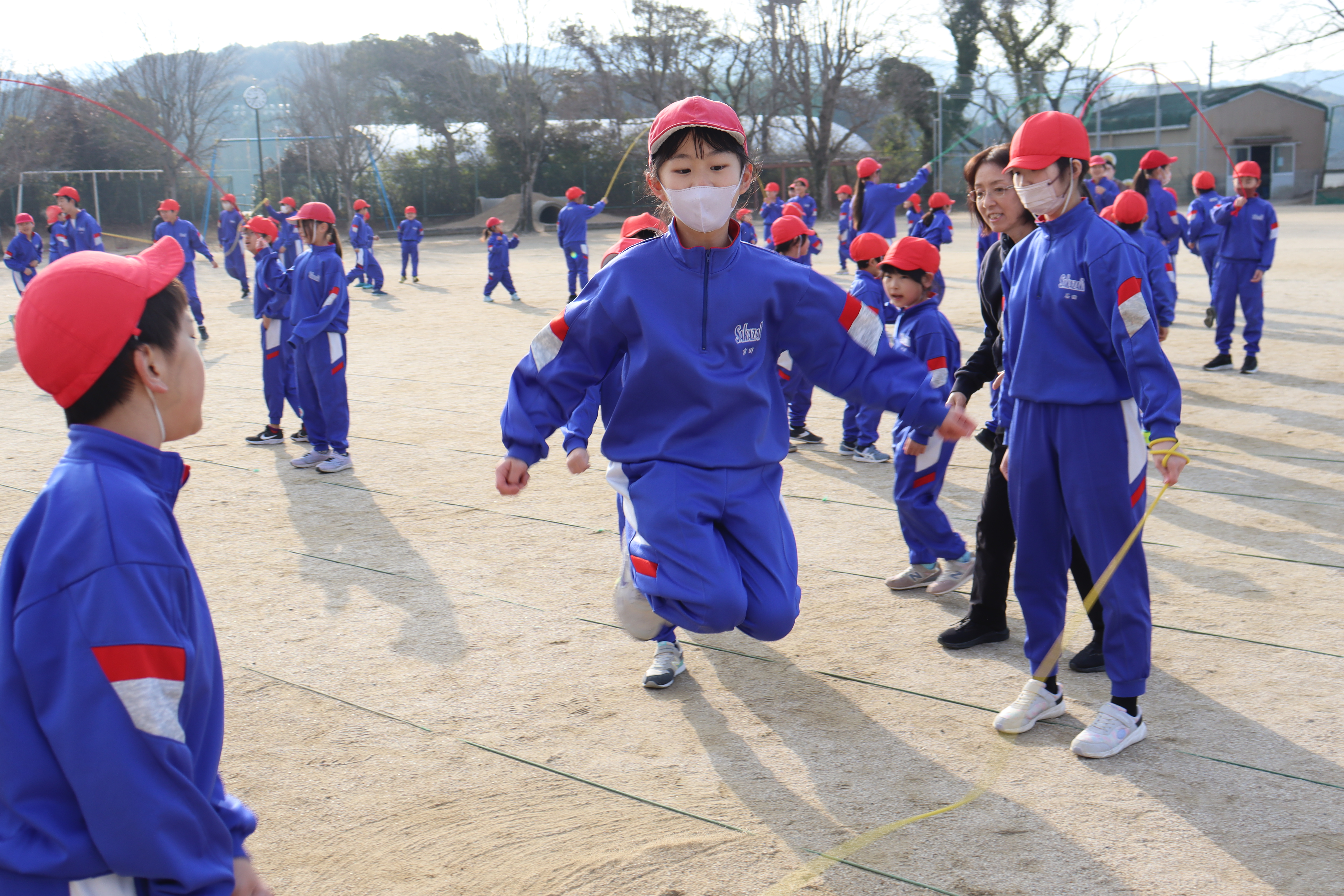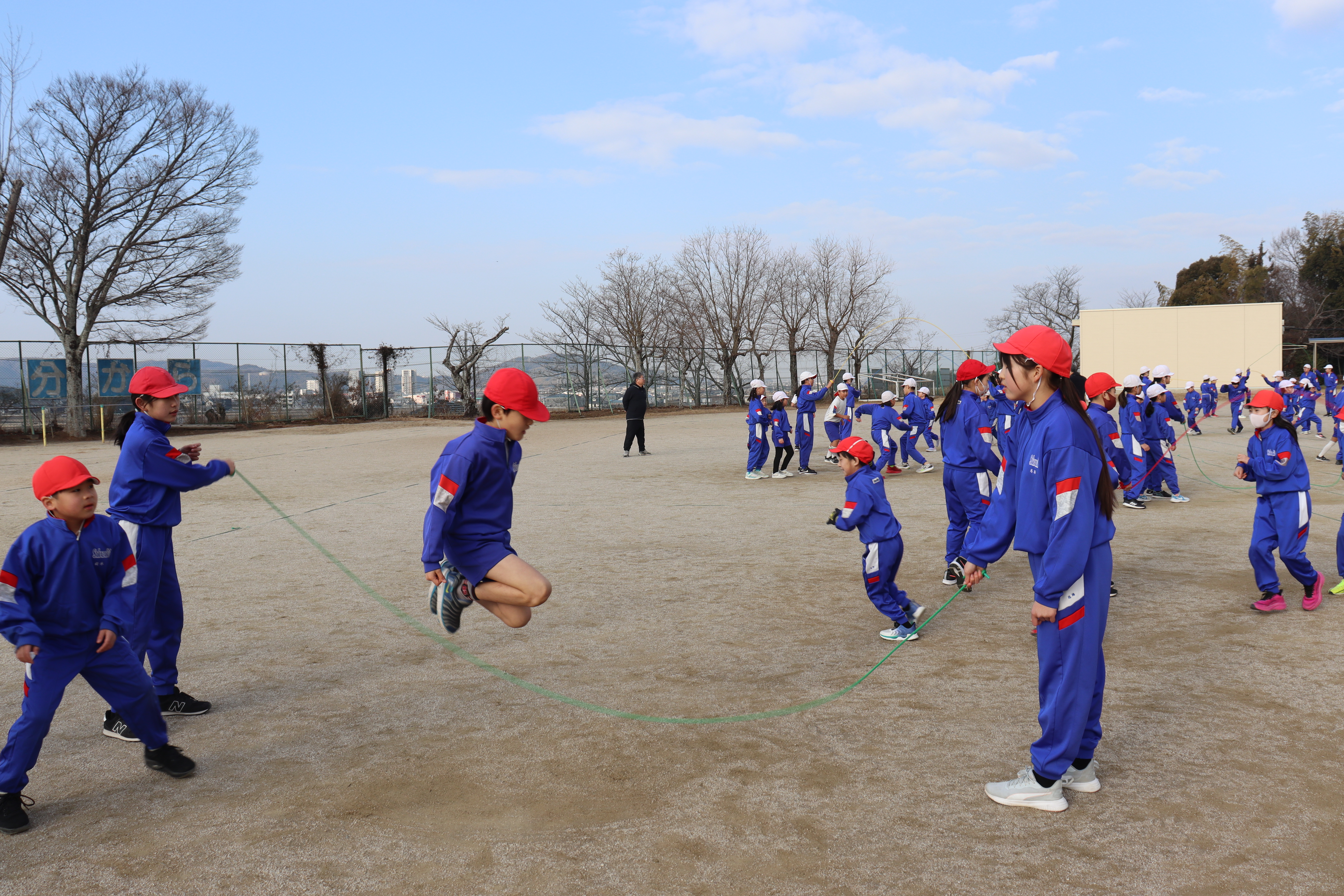 2026年2月19日 17時46分とても寒い中、全校児童で大繩大会を行いました。今年は、縦割り班をさらに2つに分けて大繩を跳びました。朝のきらきらタイムで練習してきた成果を発揮するために一生懸命取り組む姿が見られました。元気いっぱいで笑顔あふれる集会になりました。