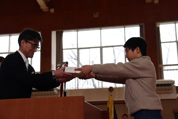 3月18日(水)に卒業記念品授与式並びに贈呈式が行われました。6年生の代表児童が、学校記念品、同窓会記念品、PTA記念品を受け取り、卒業生からは体育館に向かう渡りのパネル絵が贈呈されました。よい緊張感の中、式を行うことができました。明日はいよいよ卒業式です。卒業生、在校生ともに立派な姿を見せてくれるでしょう。