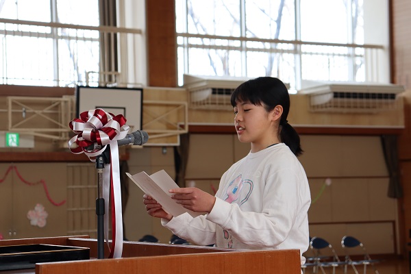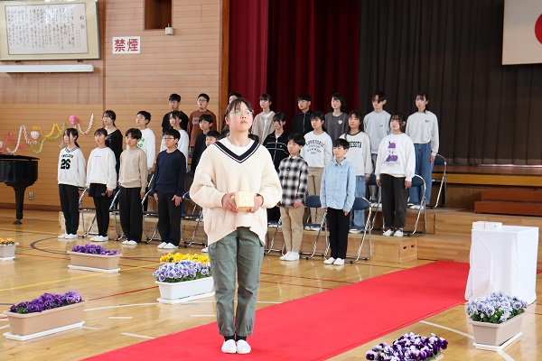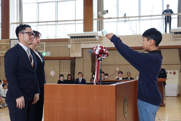 2026年3月18日 16時20分3月18日(水)に卒業記念品授与式並びに贈呈式が行われました。6年生の代表児童が、学校記念品、同窓会記念品、PTA記念品を受け取り、卒業生からは体育館に向かう渡りのパネル絵が贈呈されました。よい緊張感の中、式を行うことができました。明日はいよいよ卒業式です。卒業生、在校生ともに立派な姿を見せてくれるでしょう。